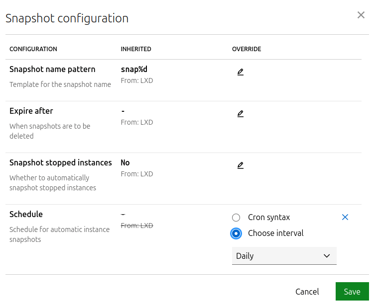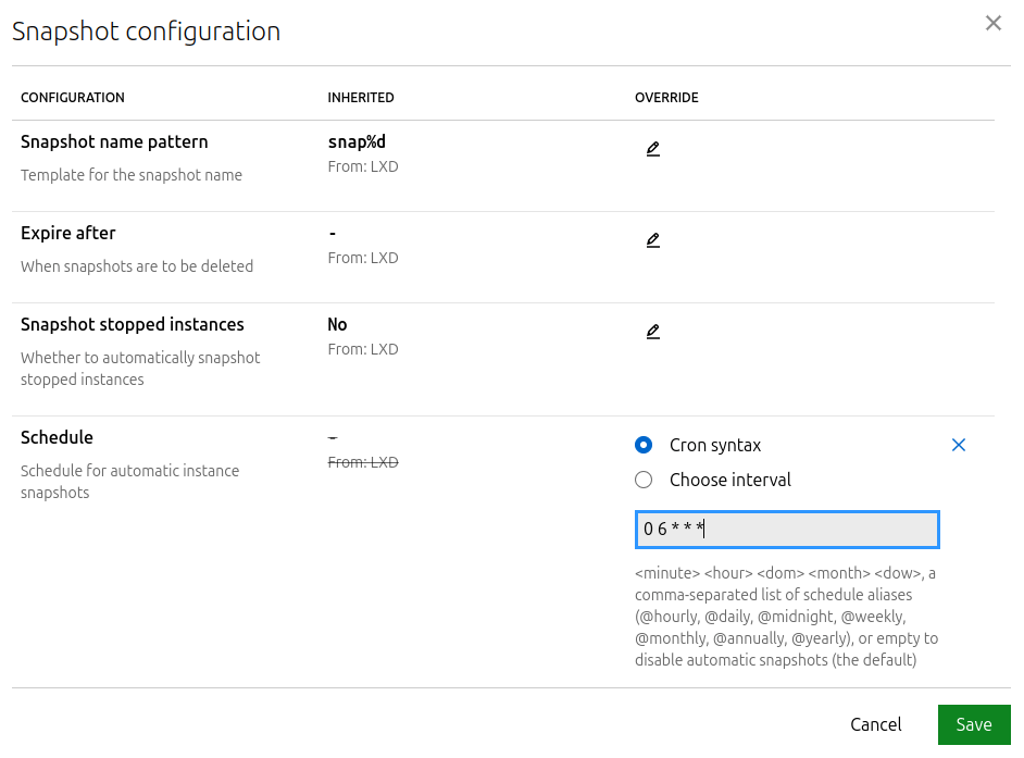 When scheduling regular snapshots, consider setting an automatic expiry (snapshots.expiry) and a naming pattern for snapshots (snapshots.pattern). You should also configure whether you want to take snapshots of instances that are not running (snapshots.schedule.stopped).